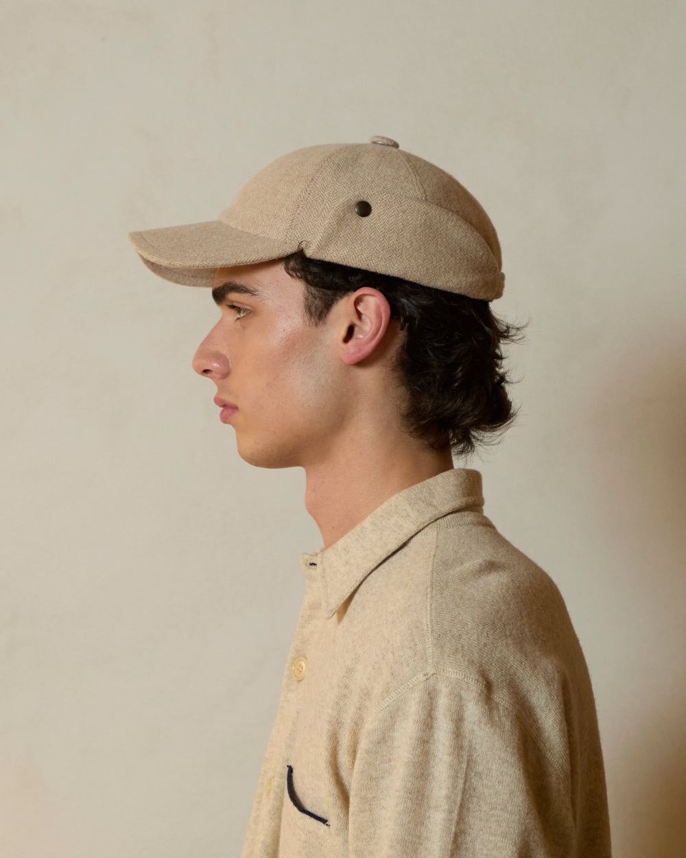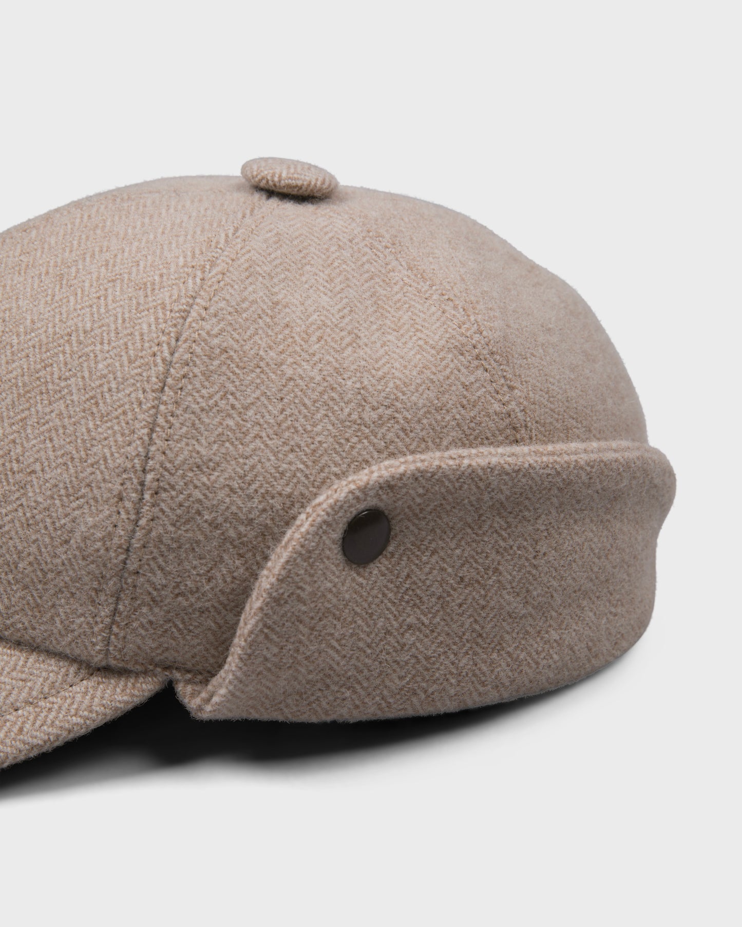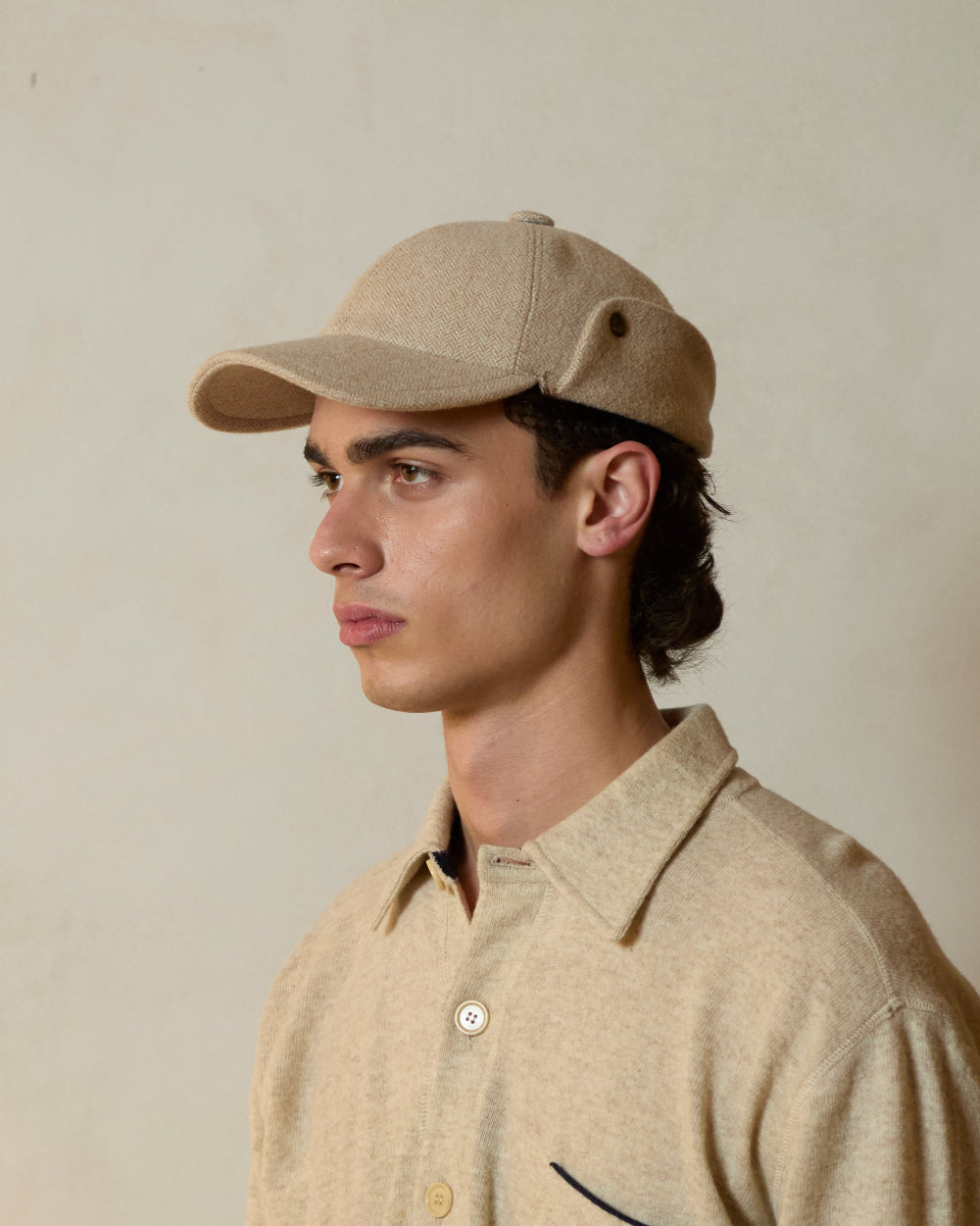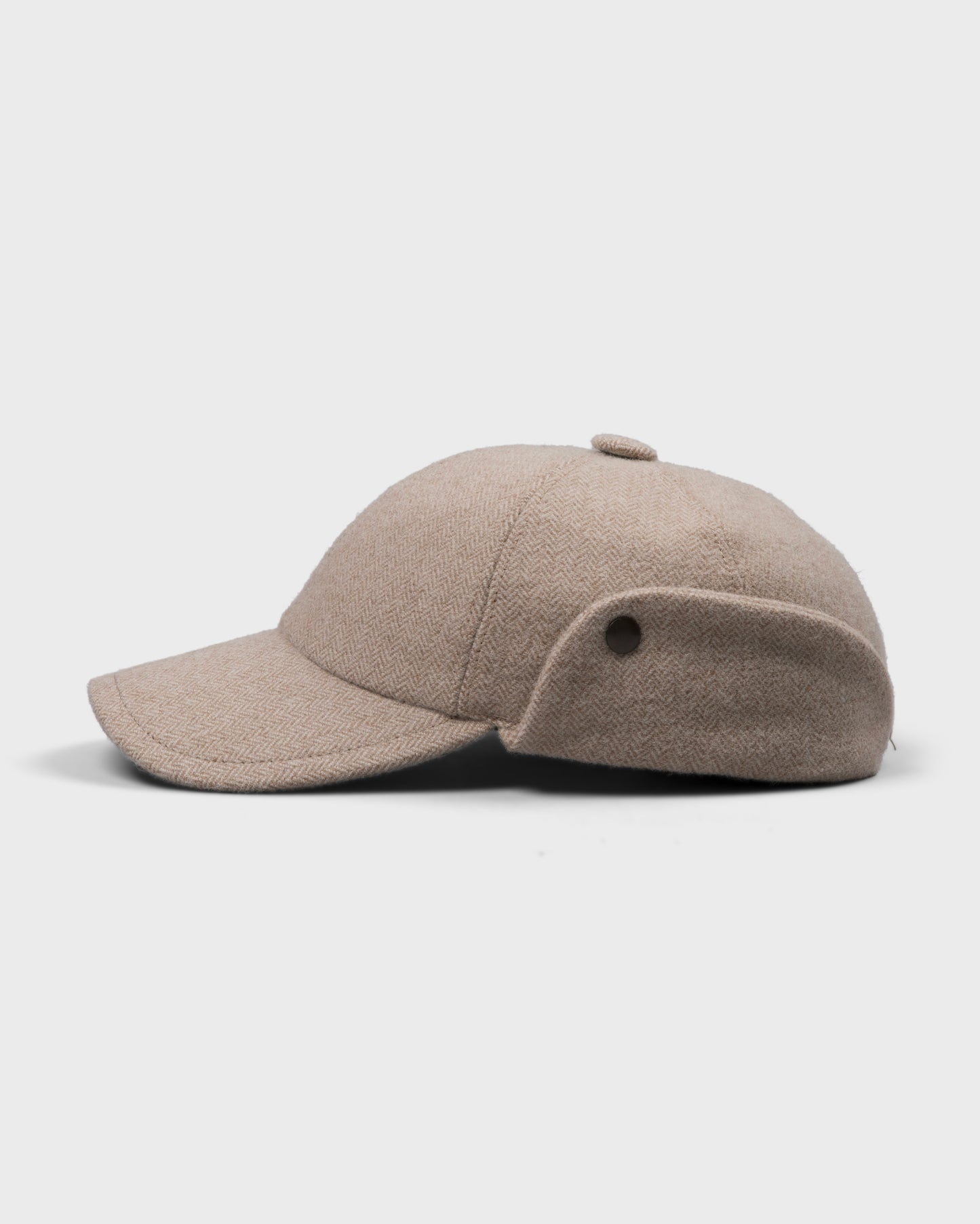 A deep, cold winter-season baseball cap with ear flaps inspired by the '60s, blending sporty style with functional warmth. Crafted from soft insulating wool, it offers comfort and protection during colder days.