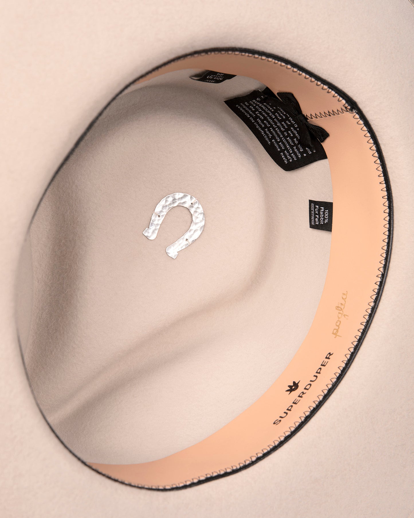 Its standout feature is the crown adorned with silver charms, adding a unique touch of character and luxury. The crown is further accentuated by a sleek grosgrain band, enhancing its refined aesthetic. Additionally, the silver hornhorse detail inside offers a subtle nod to good luck. The 7.5 cm brim strikes the perfect balance between shade and style, while the grosgrain ribbon edging completes its polished look.
