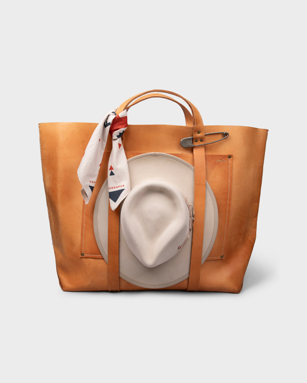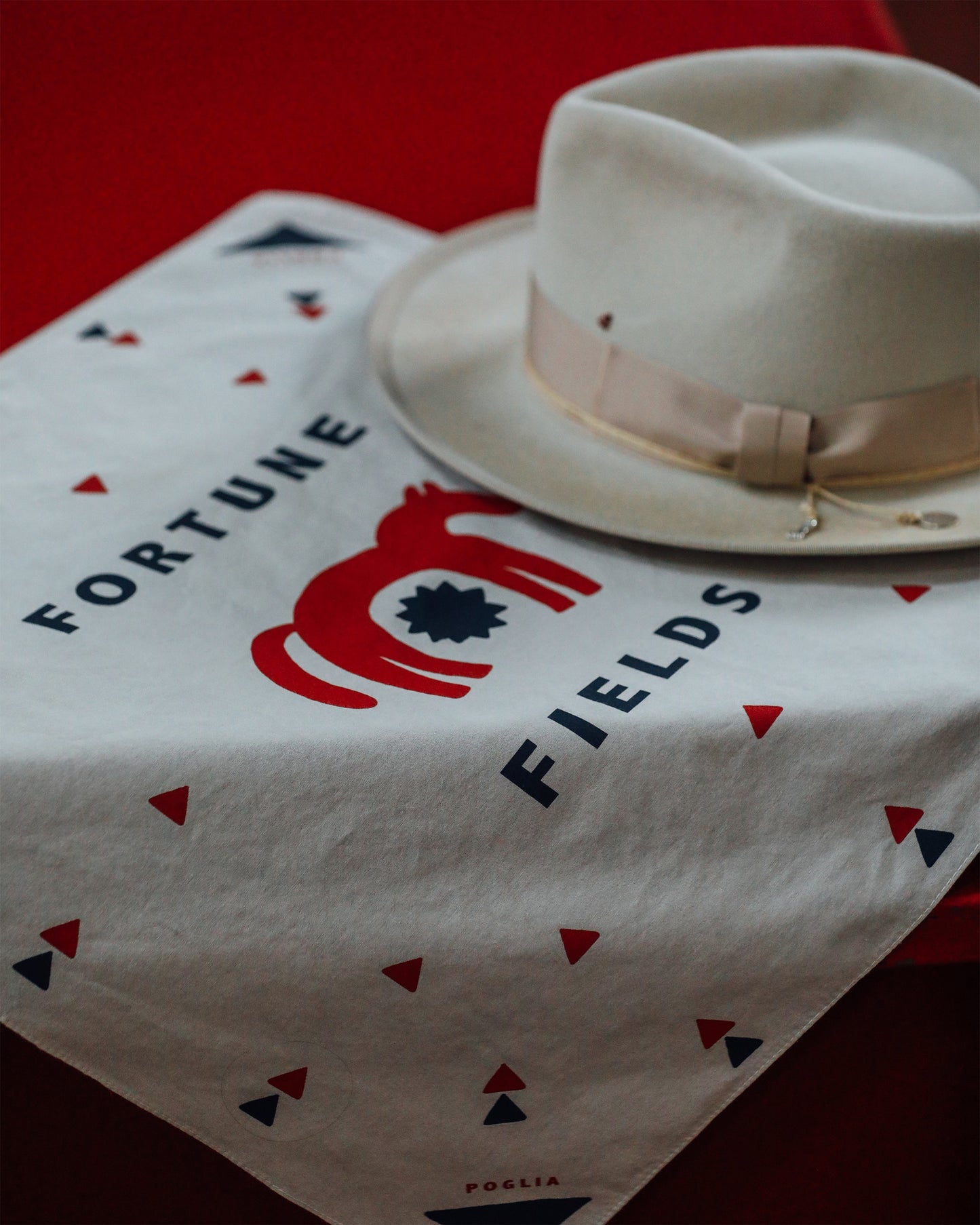 A silk-screen-printed bandana is included with the hat, designed to be worn as a head accessory under the hat or styled separately.