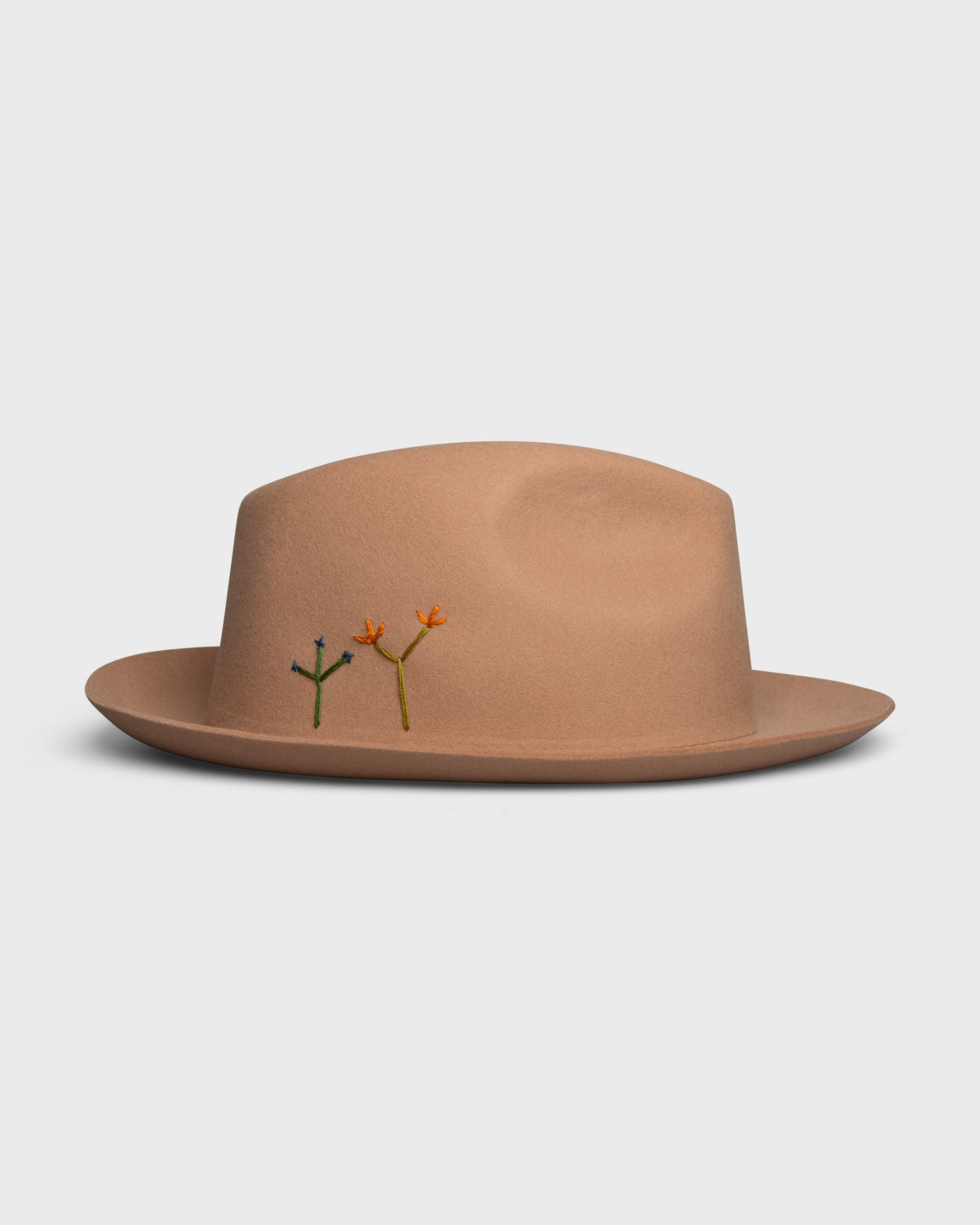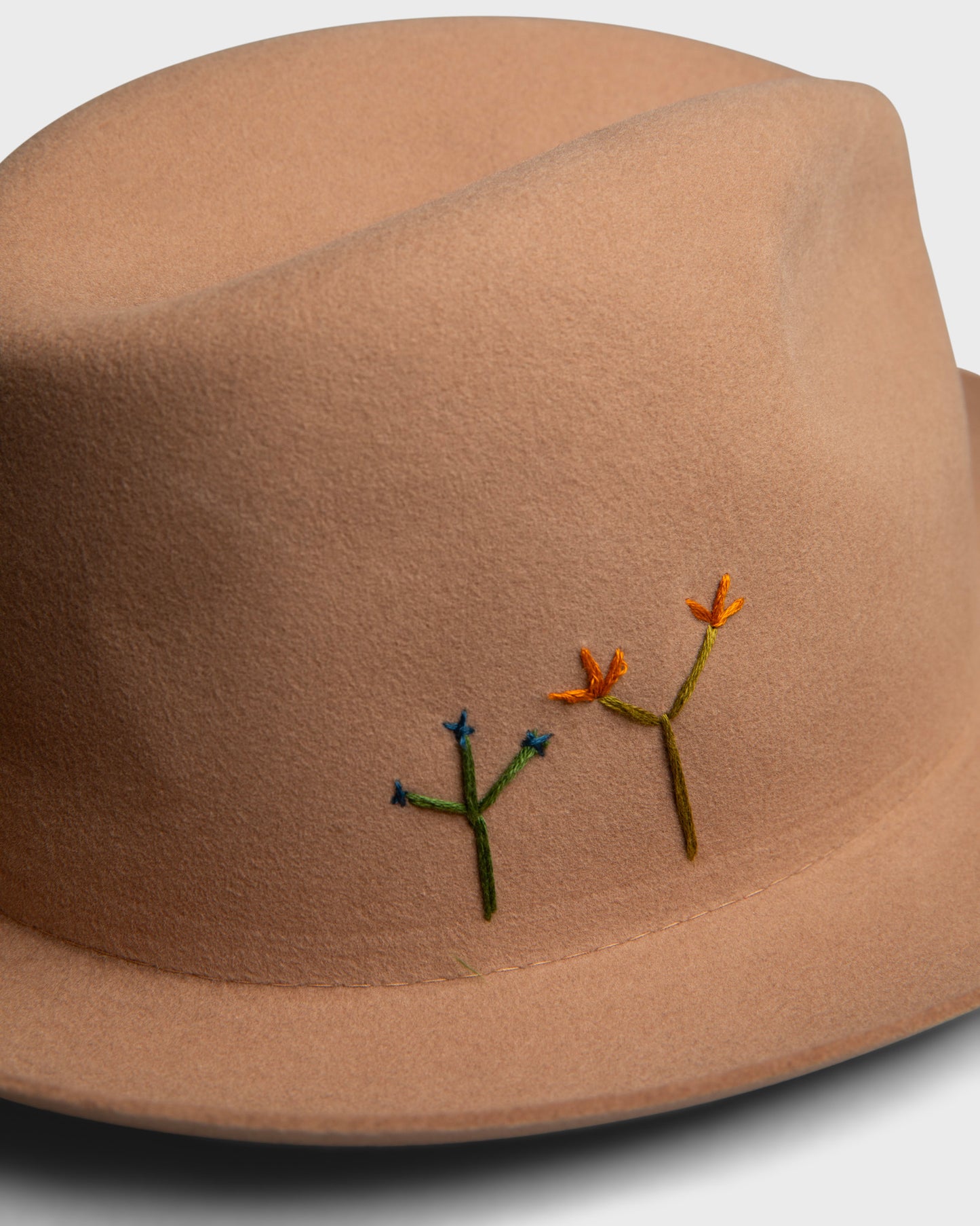 Designed to be crushable and easy to pack, HOBO can be placed in a bag or suitcase and naturally regains its shape once worn. On the left side, a small stitched cactus detail recalls the spirit of the collection, adding a subtle graphic accent without disrupting the hat’s essential design.