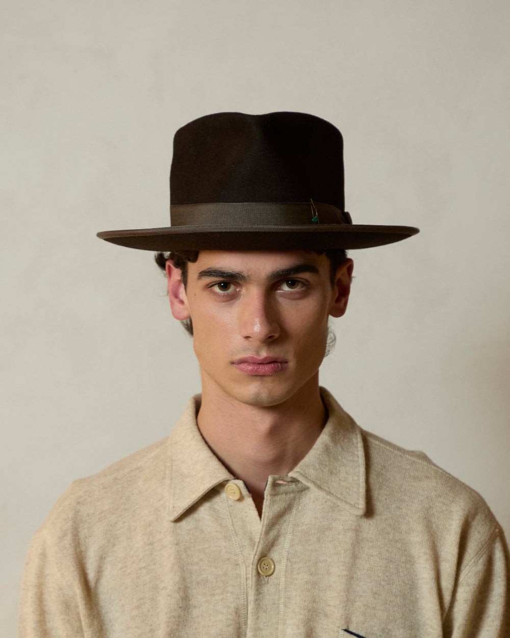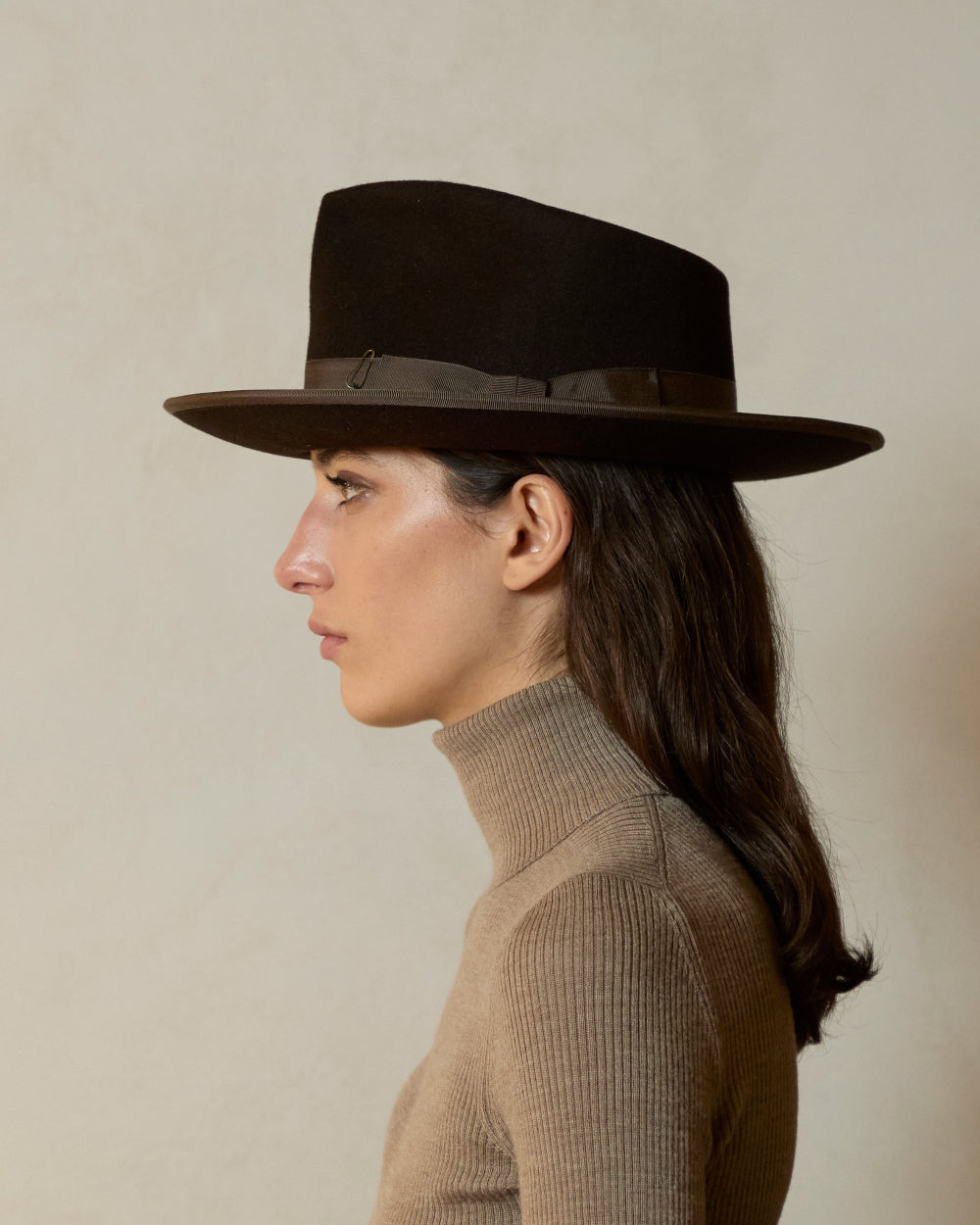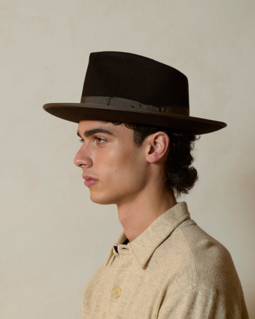 An authentic story of elegance and classic heritage. The embodiment of timeless elegance blended with a modern, contemporary statement. Crafted with an edged brim "à la française" and adorned with a classic grosgrain bow around the Teardrop crown. Meticulously made with specially selected western-weight pounced 220gr. felt, ensuring both durability and luxurious comfort.
