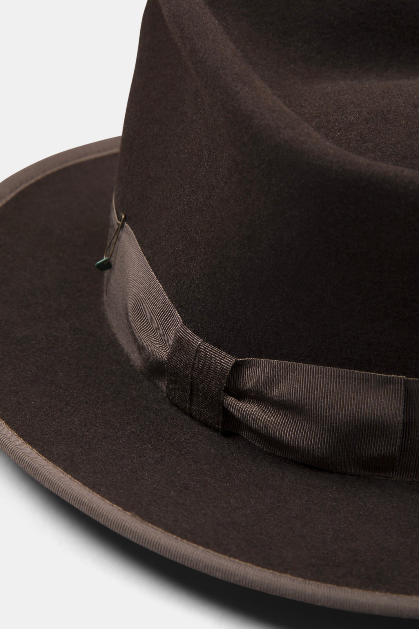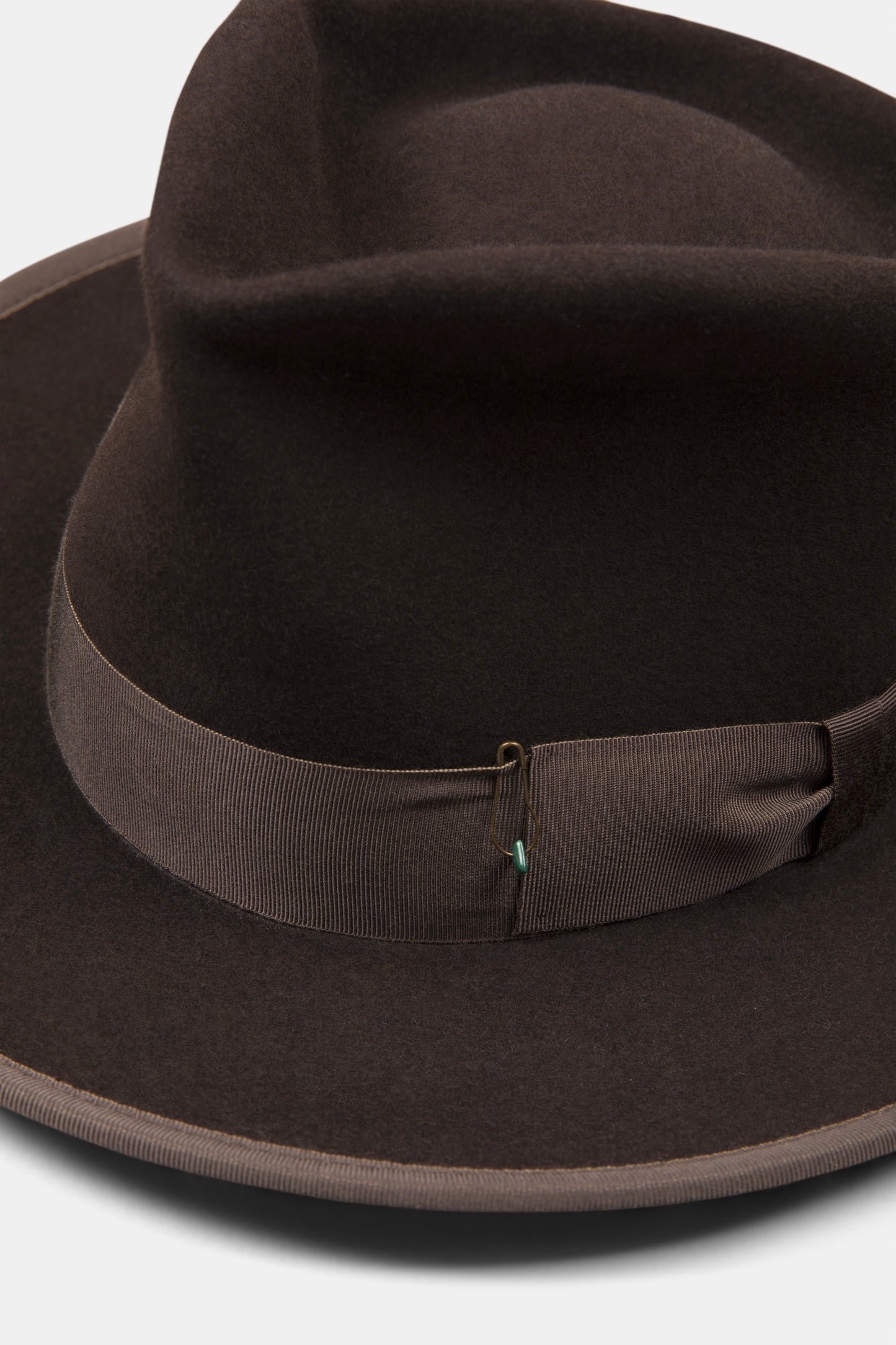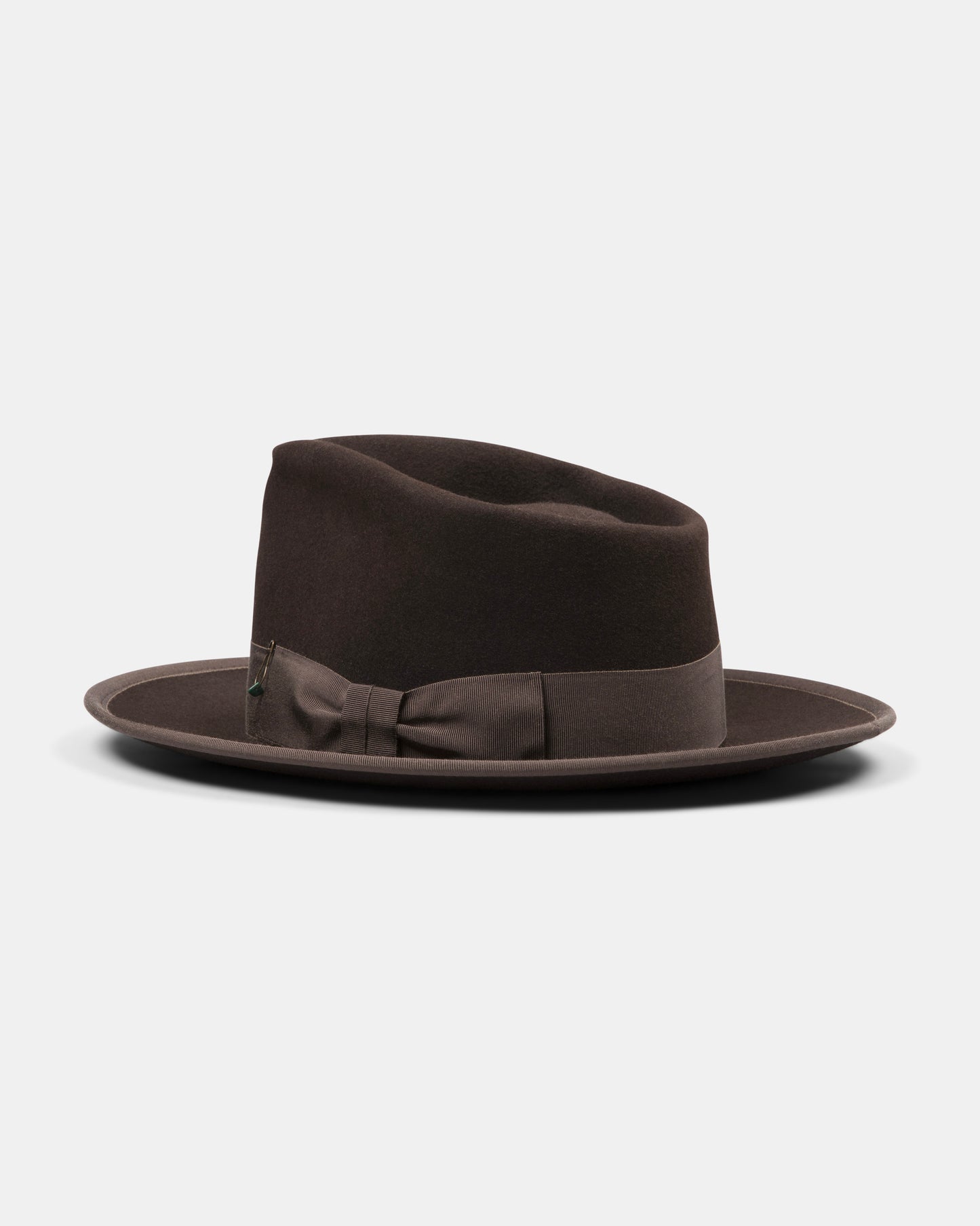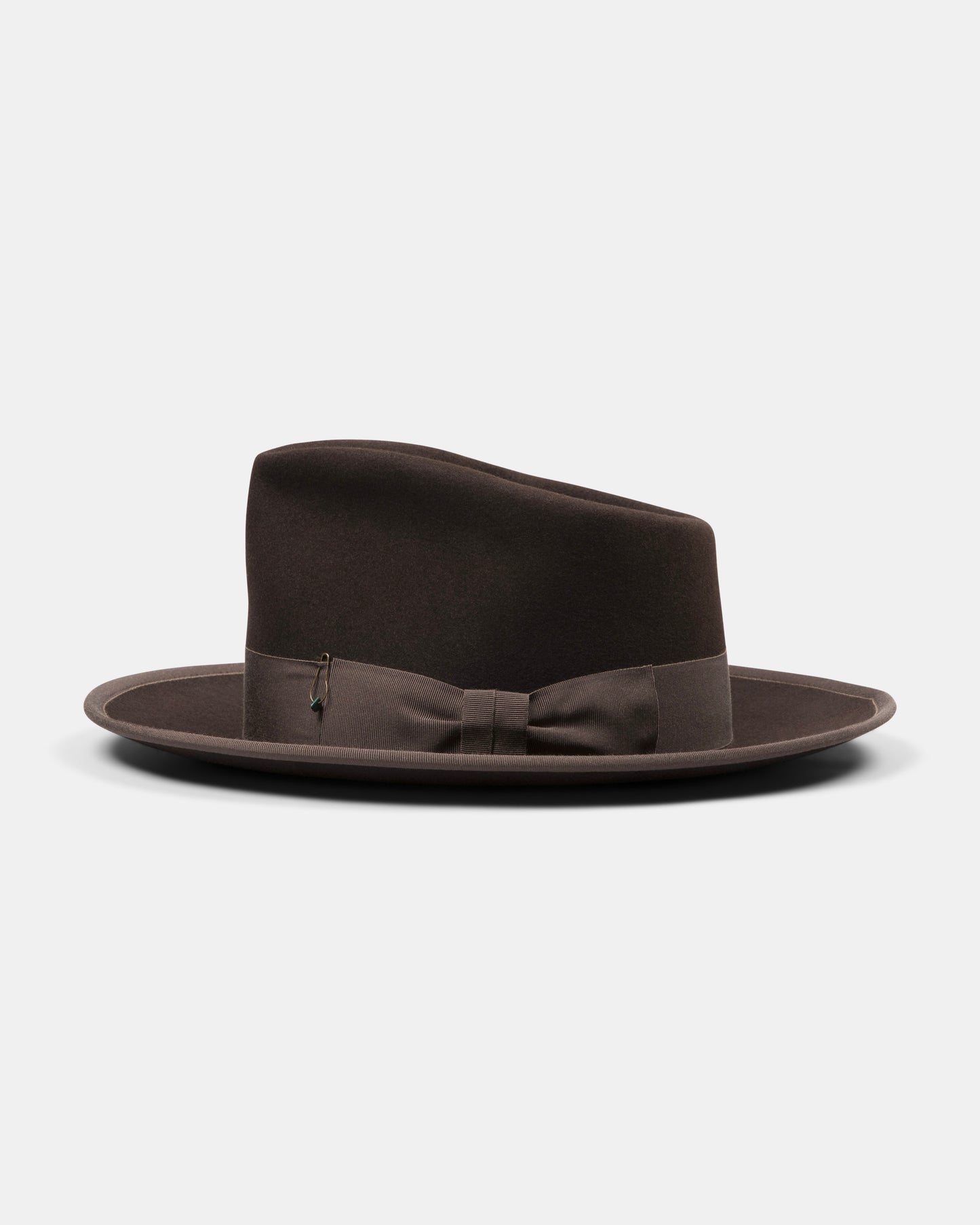 An authentic story of elegance and classic heritage. The embodiment of timeless elegance blended with a modern, contemporary statement. Crafted with an edged brim "à la française" and adorned with a classic grosgrain bow around the Teardrop crown. Meticulously made with specially selected western-weight pounced 220gr. felt, ensuring both durability and luxurious comfort.