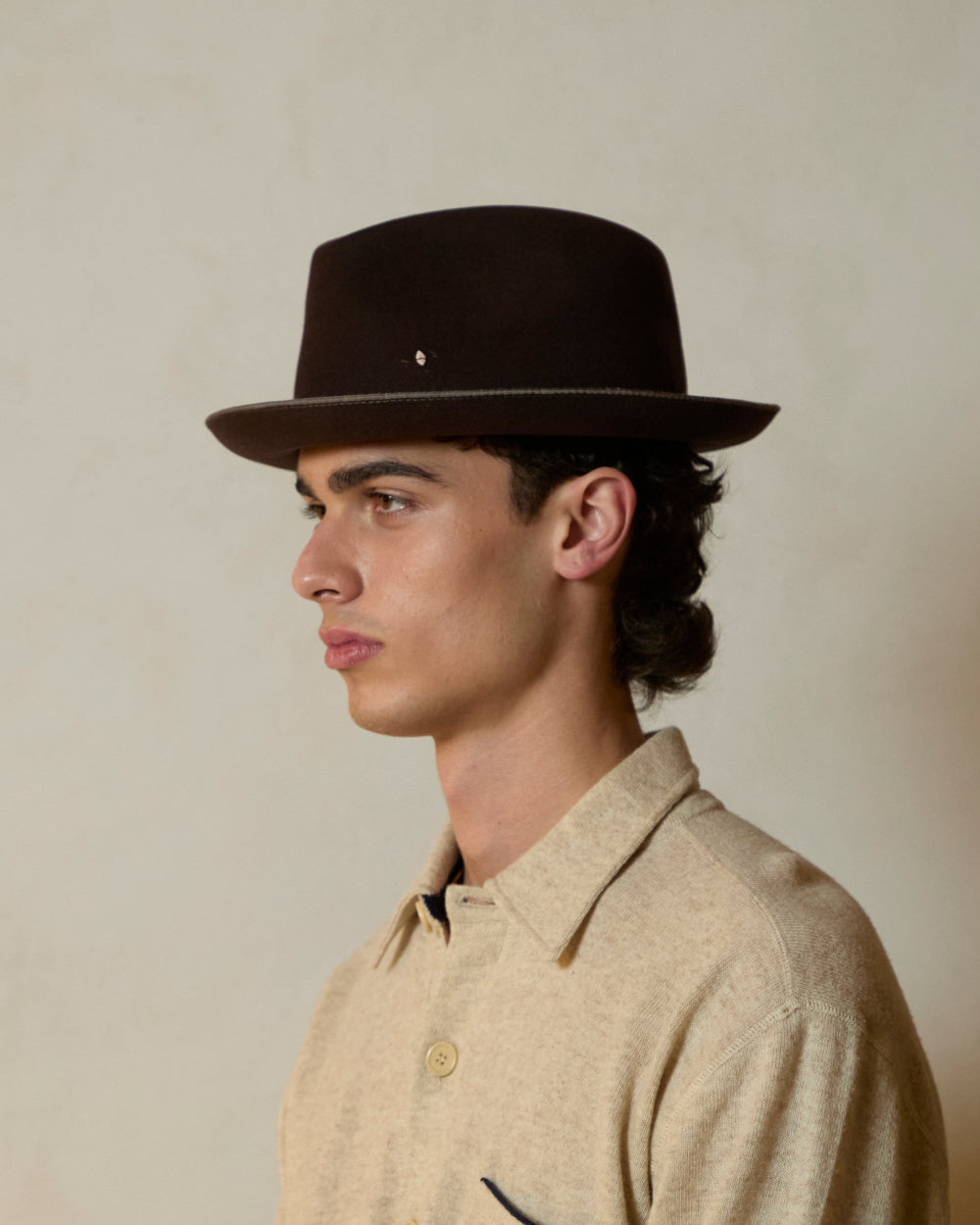 A compact box designed for those who move with purpose. The pencil, created in collaboration with Perpetua, is made of 80% recycled graphite with no added coatings. The notebook, unlined and pocket-sized, is ready for your travel notes. The brush is crafted to keep your hat clean and perfectly cared for, wherever you go.