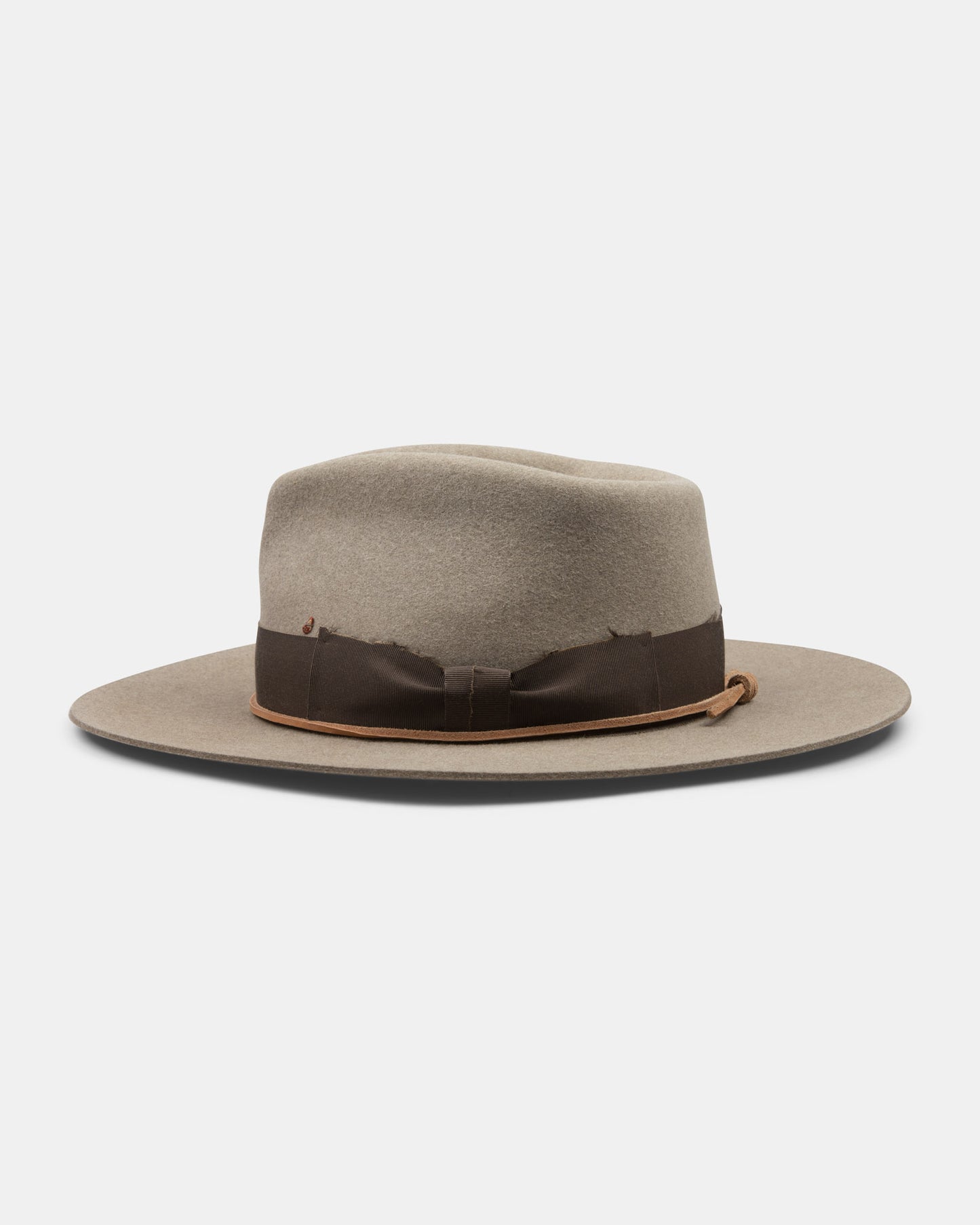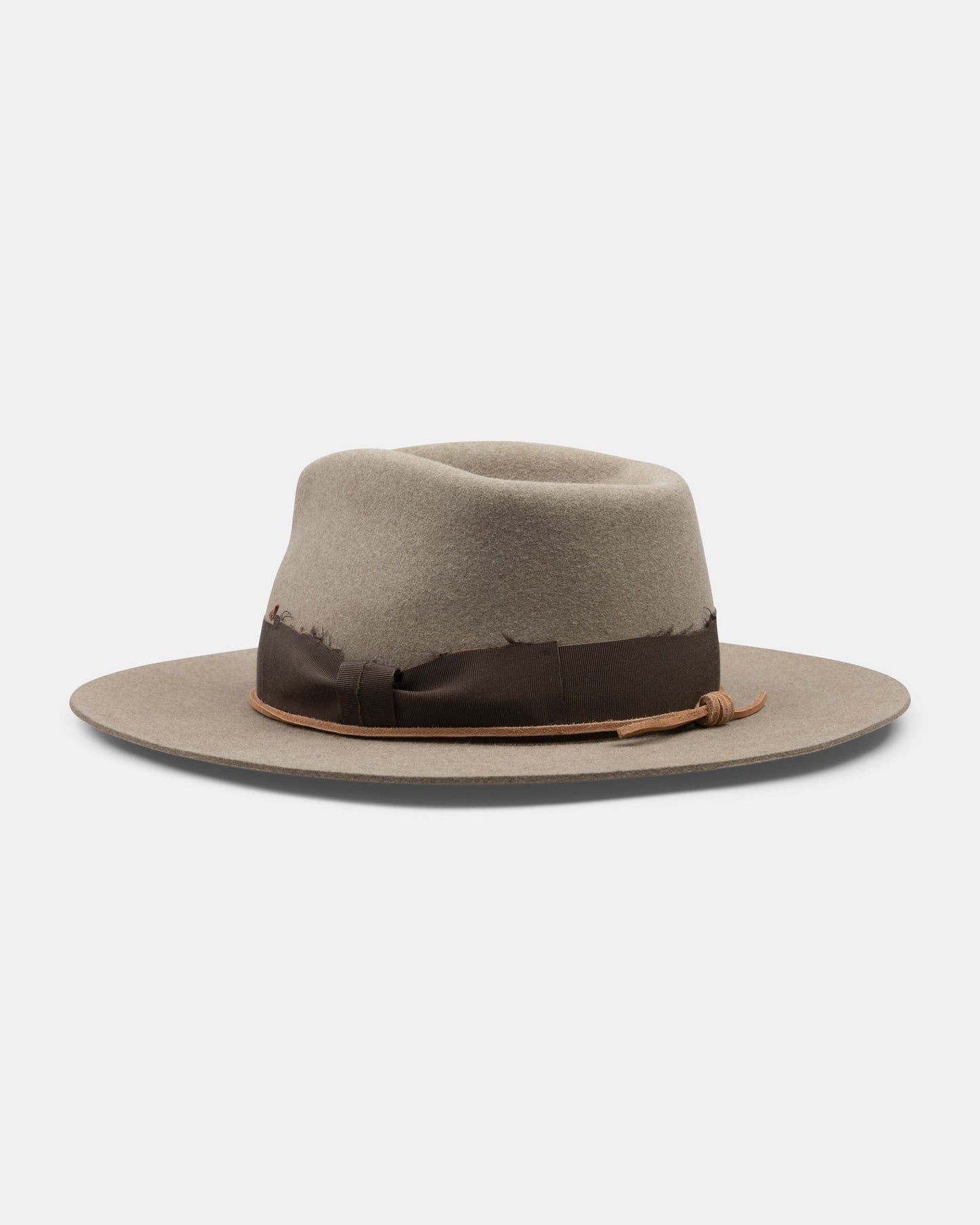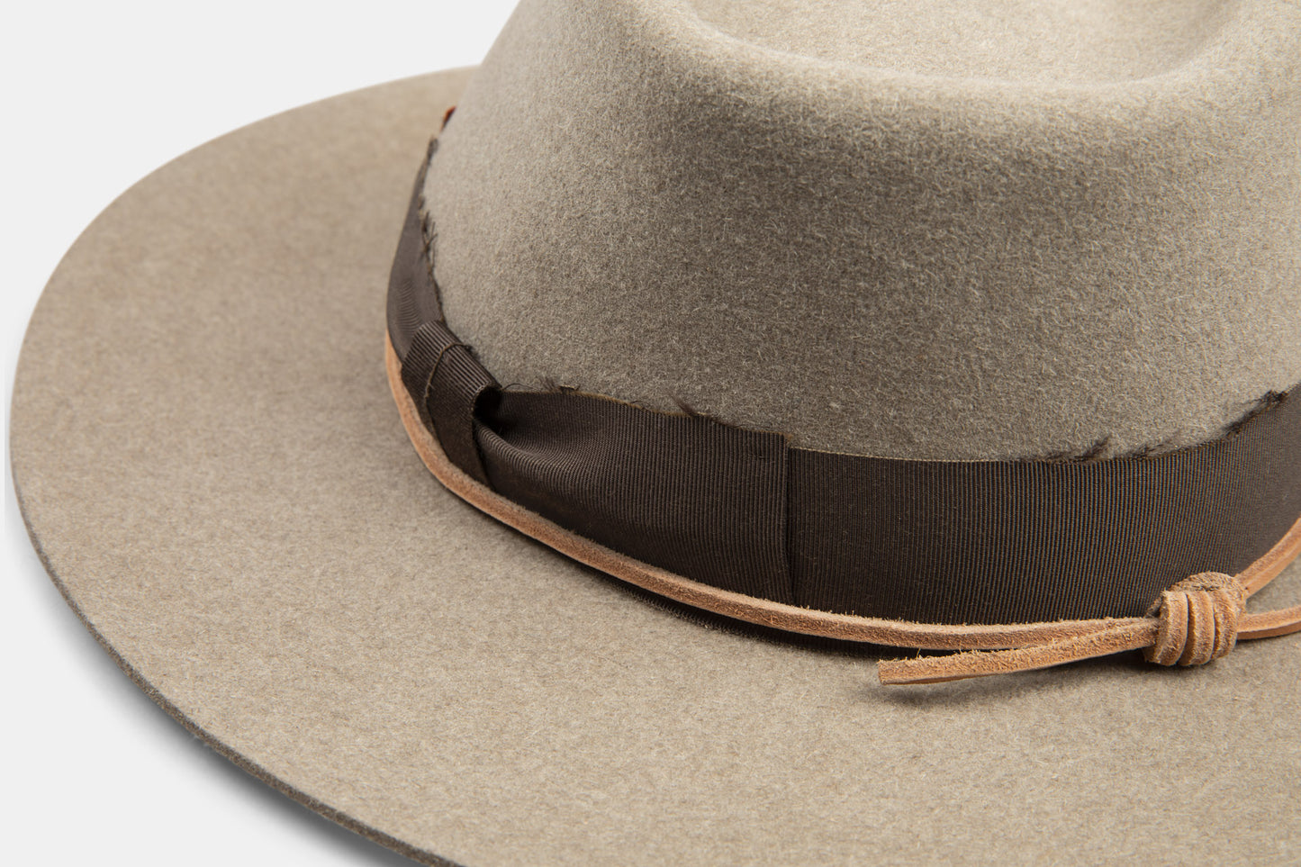 Despite being malleable enough to sculpt into the ideal shape, the teardrop crown as well as the brim remains firm and structured, the felt used is a raw rabbit fur felt which has a furry and pleasant touch.