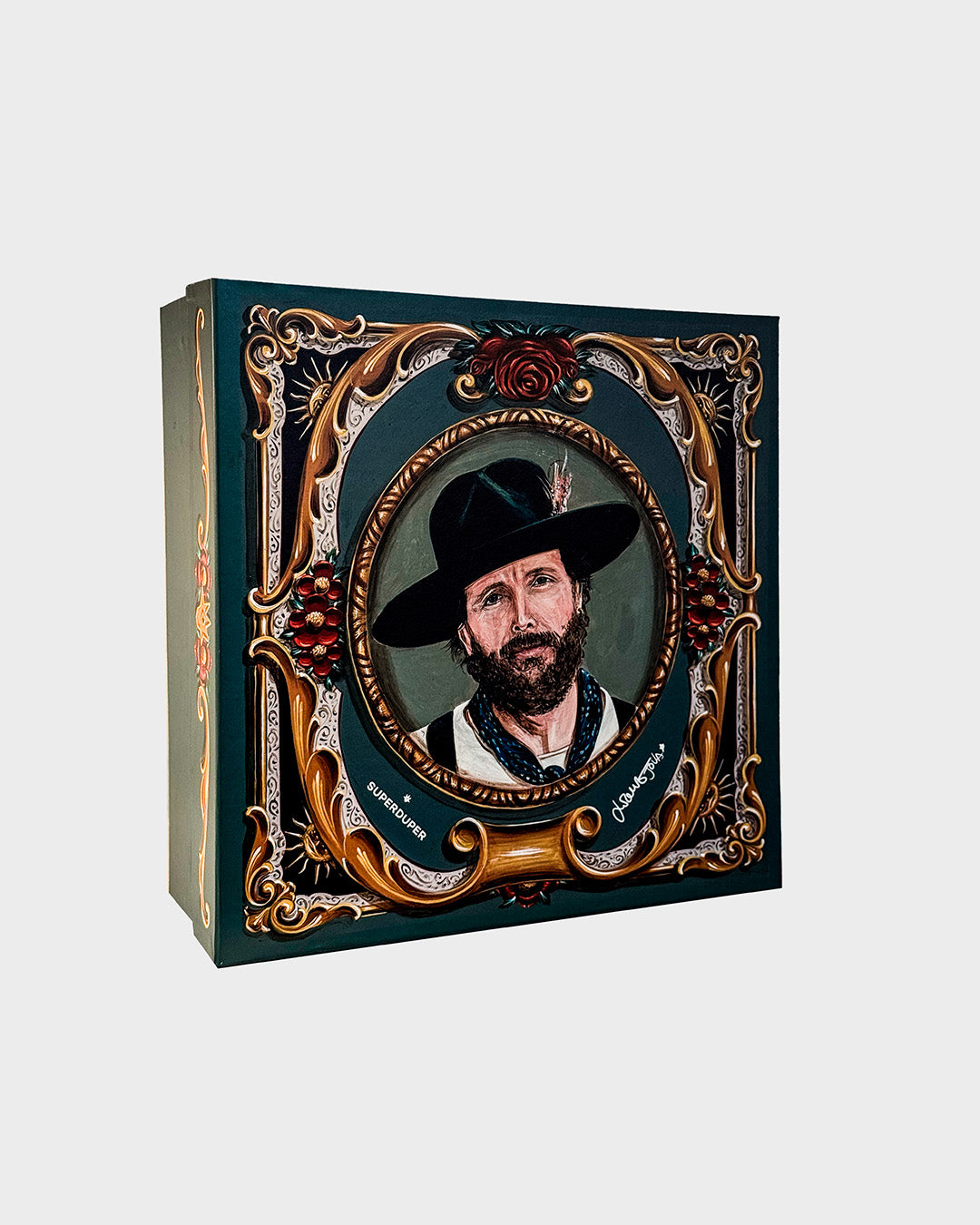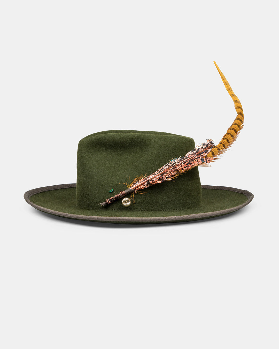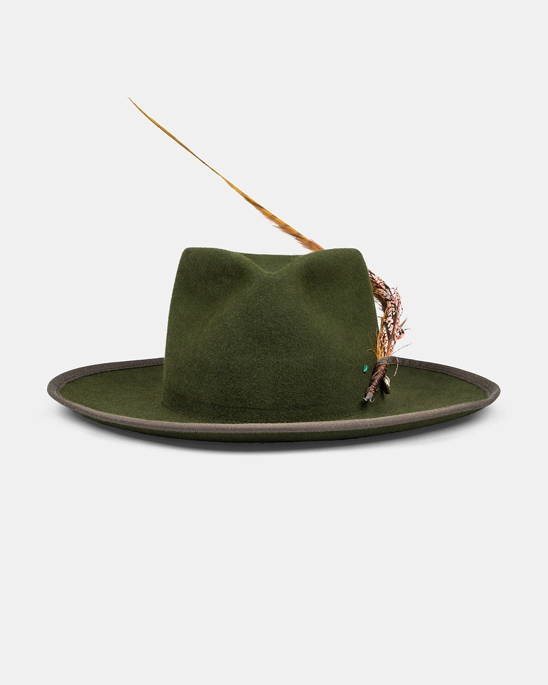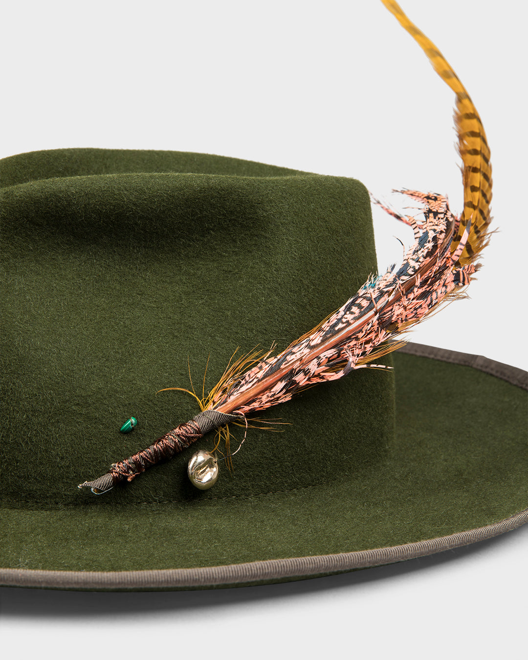 Bathed in a green hue, the hat is enhanced by a delicate grosgrain finishing tone-on-tone "à la française," creating an elegance that whispers of tradition. The crown, an iconic silhouette, is adorned with a softly stitched feather, a striking accent that speaks of passion and creativity. Inside, a special graphic patch showcases the portrait of JOVA, a tribute to artistry and soul by the Argentine Silvia Dotta that designed the external print of the box too.