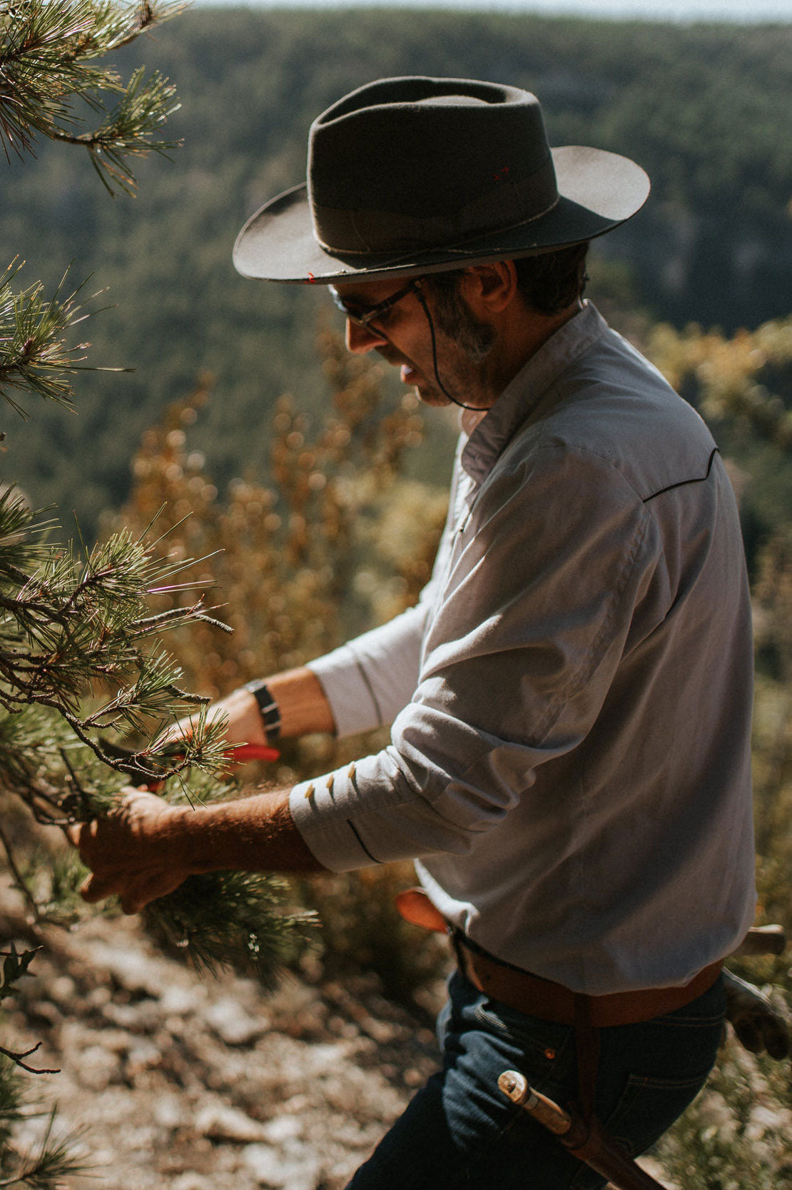For some time now, we’ve been immersing ourselves deeper in nature, to better understand and experience the mutual exchange that happens when we make our hats. It’s a philosophy we share with Bravanariz, whose fragrances “speak the language of plants”. We believe every day spent outdoors is an adventure.As part of the collaboration, we’ve released a custom hat shape that recalls life in the wilderness, along with a unique scent based on the plants that speak to us. Combining rosemary, sage, lavender and pine resin, it has a punchy smell that evolves depending on its application. When sprayed on the hat’s organic cotton lining, it goes where you go. Into the wild.