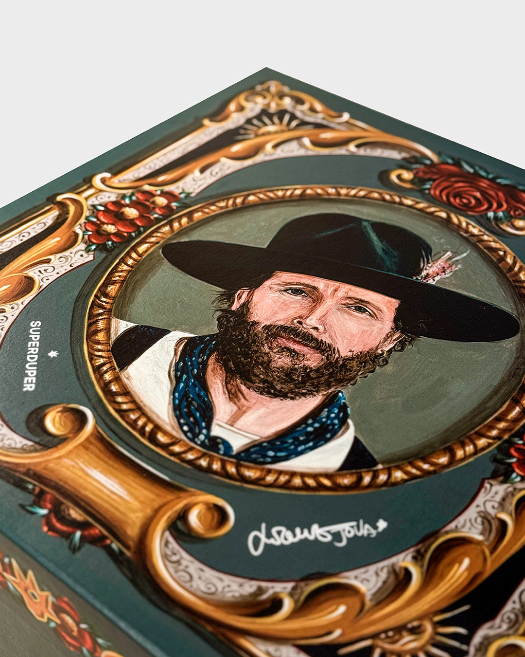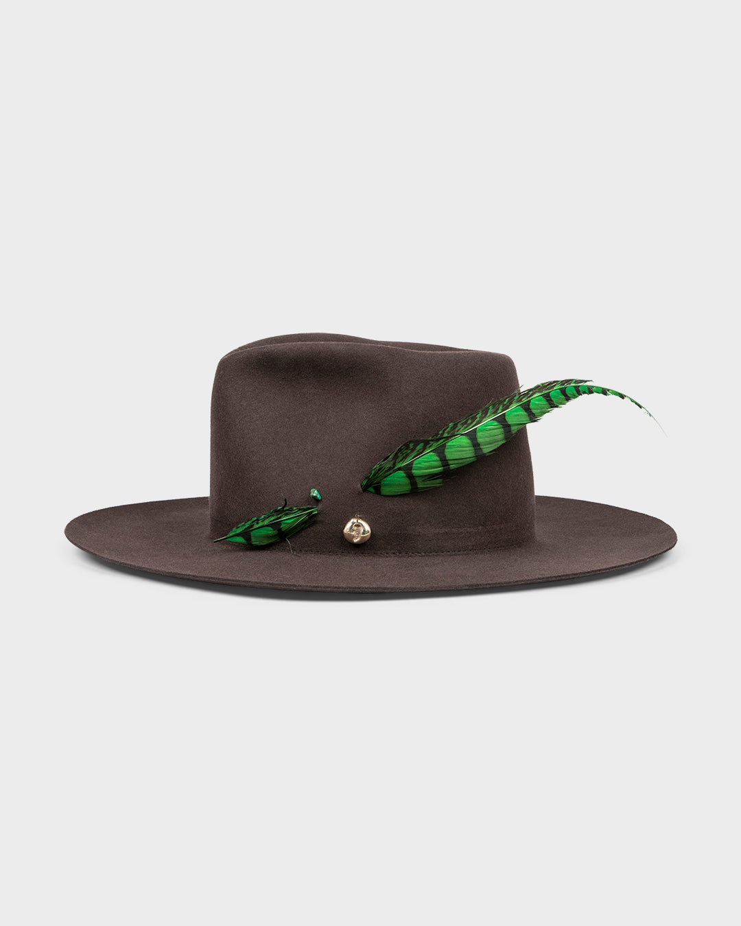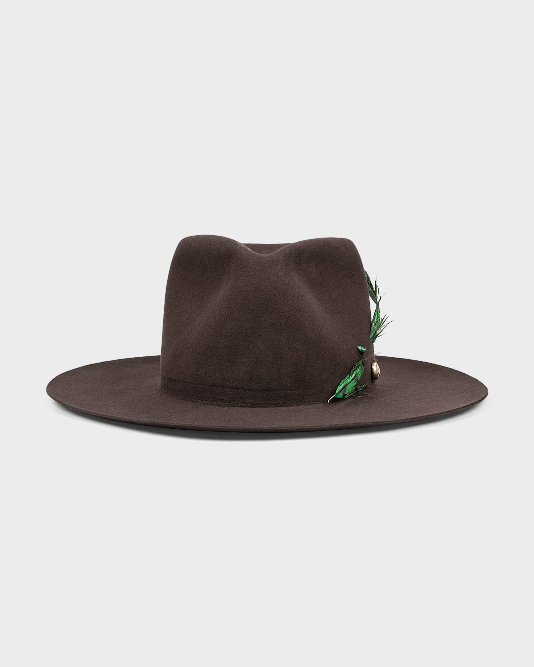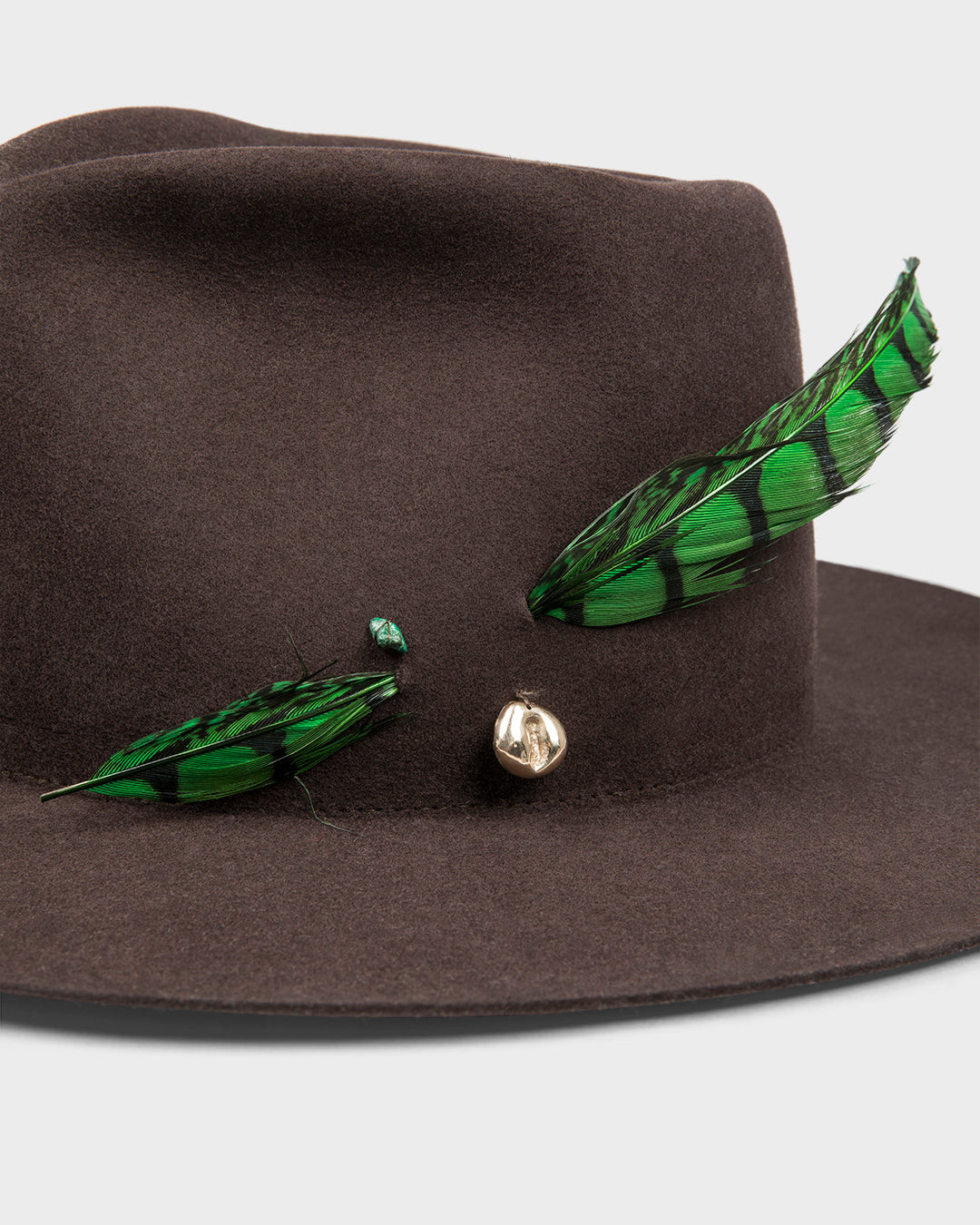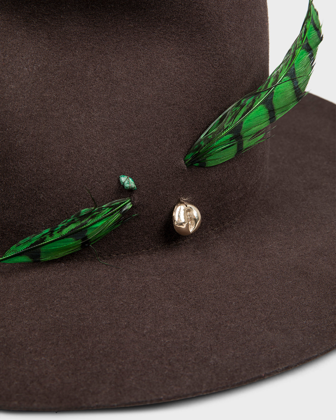 Crafted in a Brown premium felt, the crown of the hat is enriched by a green feather, creating a gentle contrast of colors: bold accent that speaks of passion and creativity. Inside, a special graphic patch showcases the portrait of JOVA, a tribute to artistry and soul by the Argentine Silvia Dotta that designed the external print of the box too.