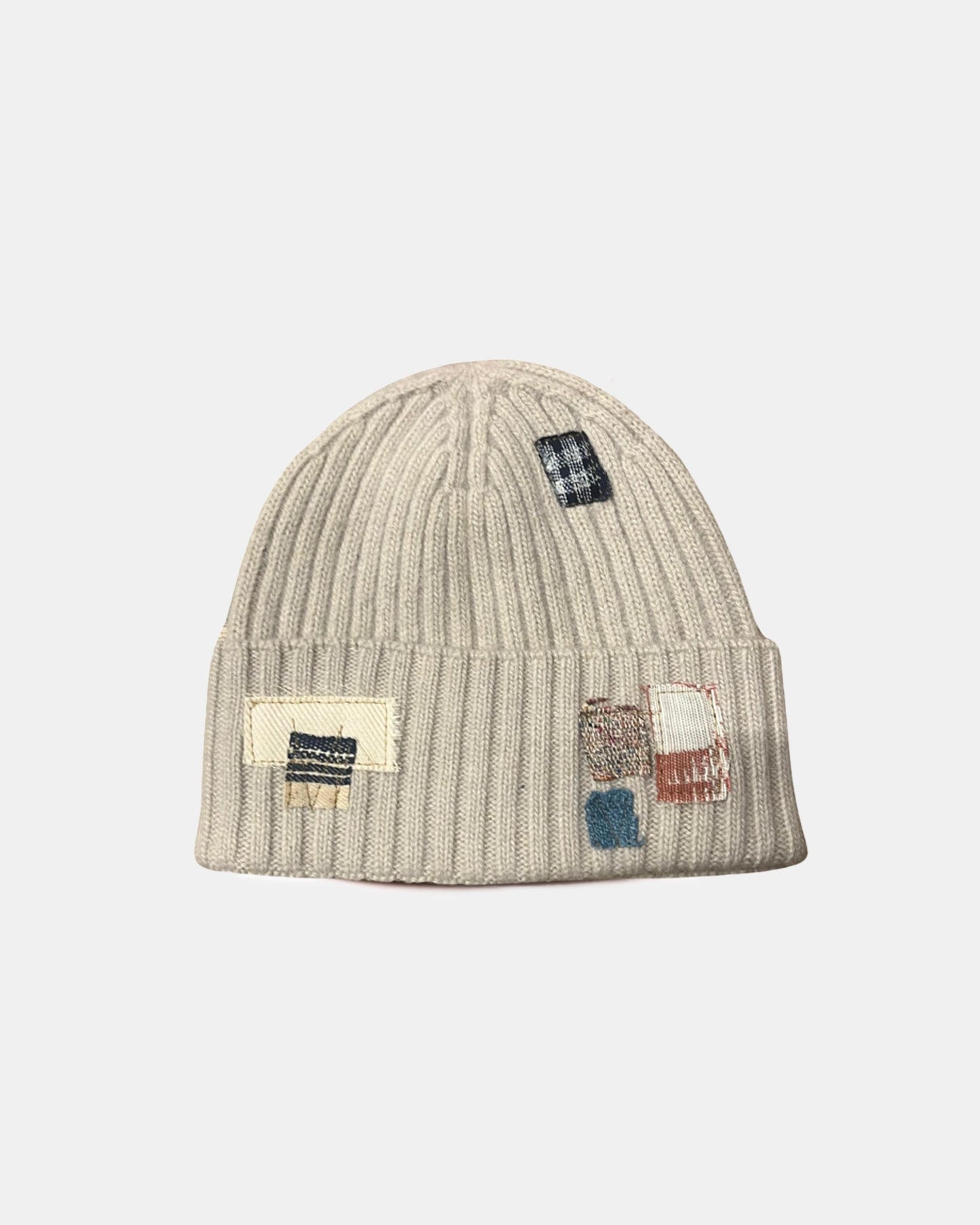 A traditional Fisherman beanie featuring an embroidered repair stitch detail all over, adding a unique, handcrafted touch.